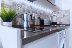 La cucina completamente attrezzata include angolo cottura con piano cottura elettrico, forno a microonde senza lavastoviglie (frigorifero senza congelatore), tostapane elettrico per tè e caffè con le relative attrezzature più tavolo da pranzo dotato anche di seggiolone per bambini. L’intrattenimento è garantito dalla TV a schermo piatto con servizi streaming, molteplici opzioni WiFi sono disponibili in tutta la proprietà incluse hotspot portatili. L’appartamento dispone inoltre dell’ascensore ed è dotato di misure sicurezza come estintore interno, all’esterno vi sono mobili dedicati sia sul balcone sia sul patio pensati per pranzi o momenti relax.