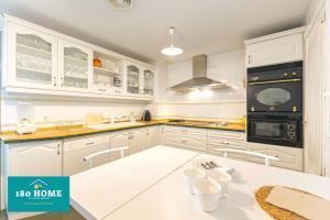 The apartment includes a fully equipped kitchen with both kitchenette facilities and a full kitchen for cooking and storing food. It comes with three bathrooms alongside room amenities such as heating, air conditioning, a washing machine, and a flat-screen TV.