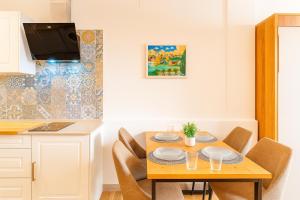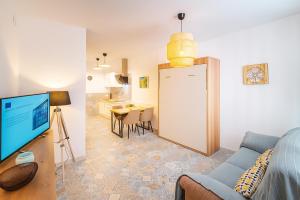À l’intérieur de l’appartement se trouvent une chambre ainsi qu’un salon avec deux lits et un coin canapé pour se détendre. Le coin cuisine entièrement équipé comprend des équipements modernes tels qu’une plaque de cuisson, un réfrigérateur, un lave-vaisselle, un micro-ondes, un grille-pain, une machine à café et une bouilloire électrique ainsi que la vaisselle et une table pour préparer les repas.