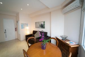 This air-conditioned apartment offers a private entrance, one bedroom, a living room with a sofa bed, and one bathroom equipped with a shower and hairdryer. The full kitchen includes modern amenities such as a microwave, coffee machine, refrigerator, toaster, electric kettle as well as tea and coffee making facilities alongside kitchenware and a dining table.