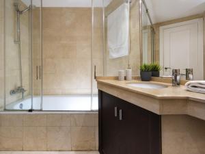 Inside this wheelchair-accessible unit are two separate bedrooms and two bathrooms featuring bathtubs or showers along with complimentary toiletries including shampoo and body soap. The full kitchen comes equipped with a stovetop, refrigerator, dishwasher, microwave, toaster, coffee machine and electric kettle complemented by kitchenware and dining facilities such as a dining table and high chair for children. Additional conveniences include air conditioning throughout the space alongside seating areas furnished with sofas and a television.