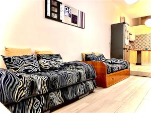 Inside, the accommodation comprises one separate bedroom, one living room with a sofa bed and extra rollaway beds totaling five beds in all, as well as one bathroom equipped with a walk-in shower without steps or bathtub options. The fully equipped kitchen includes a refrigerator, microwave, toaster, coffee machine, kitchenware and dining table to cater to all cooking needs.